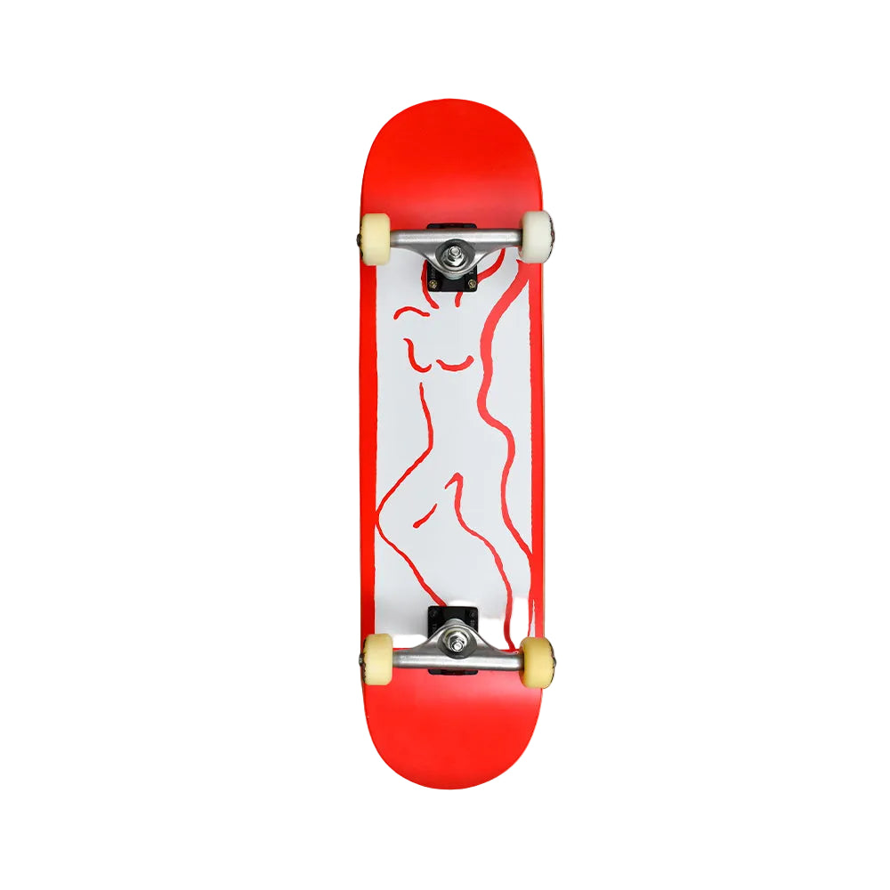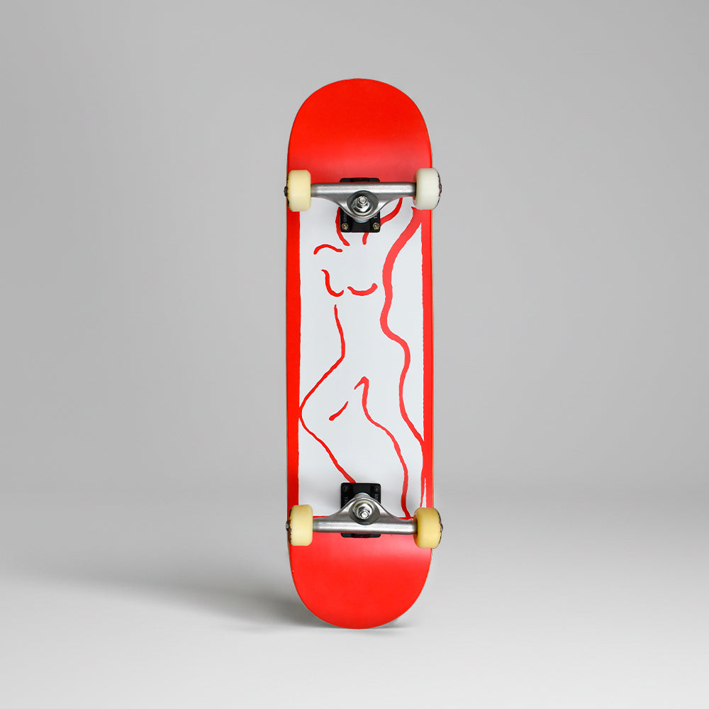 Colores: La combinación de rojo vibrante, el blanco puro del gráfico y los detalles metálicos de los trucks crea un contraste dinámico y visualmente potente.